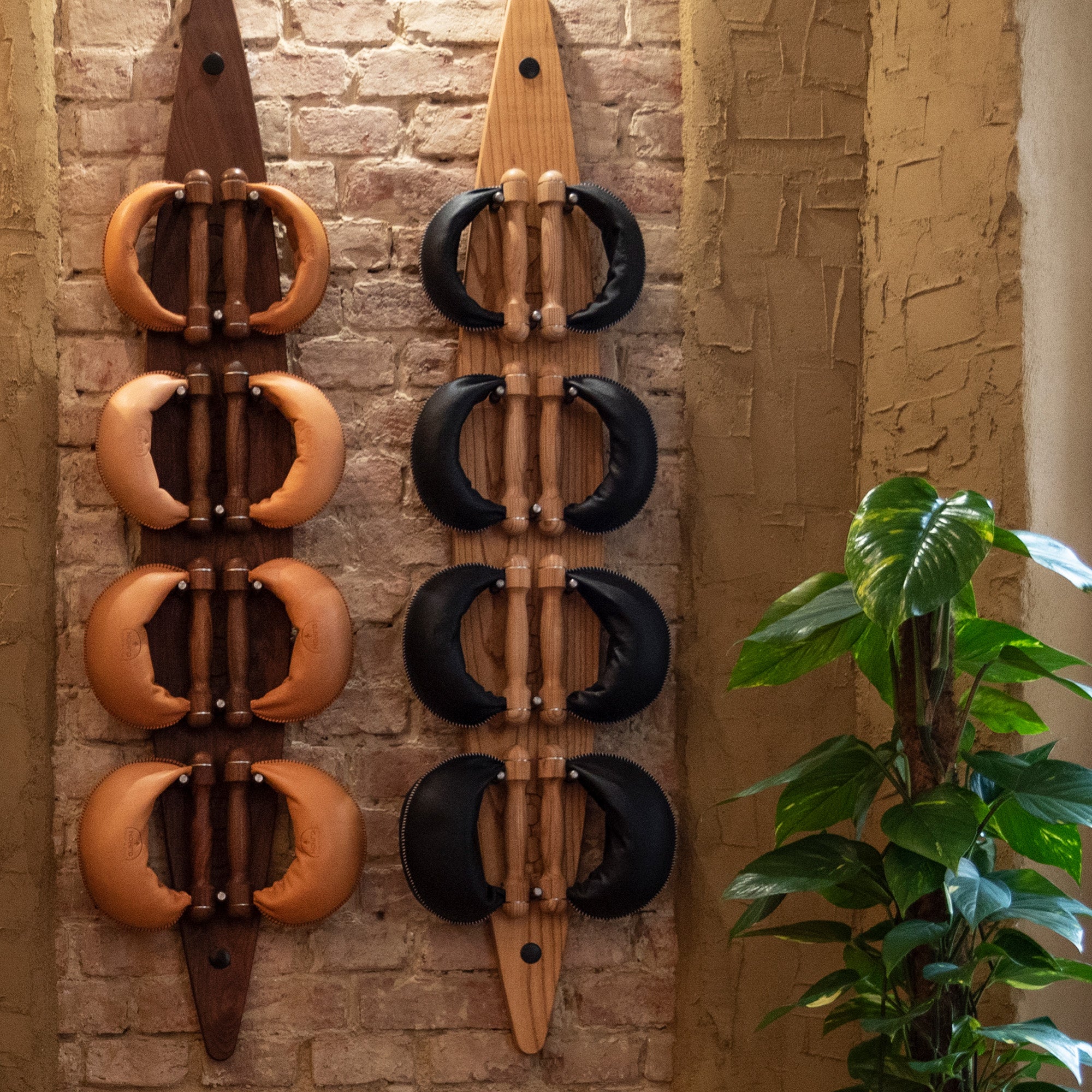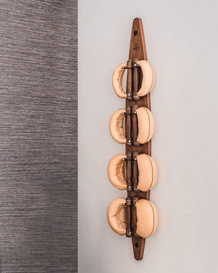 A story of meticulous craftmanship: SwingBells are hand-stitched with genuine leather and filled with iron granules, masterfully combining balance and motion when in use, forcing an element of controlled asymmetry as the pellets shift within the leather pouch. Our walnut SwingBells are available in natural or black leather options.
