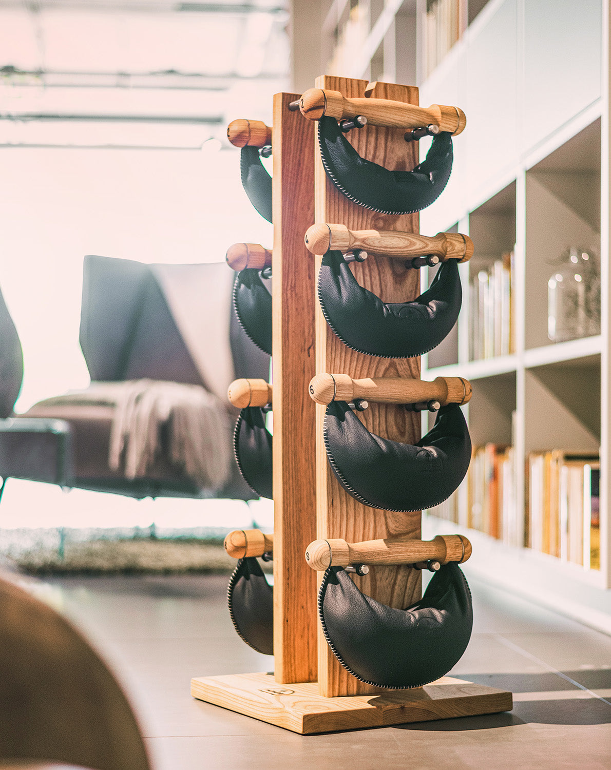 Even when at rest, our SwingBells radiate sophistication and style in any interior. Whether stored on the Swing Tower or Swing Board, a full set of 4 pairs of weights (2, 4, 6, and 8 kg) require minimal space.